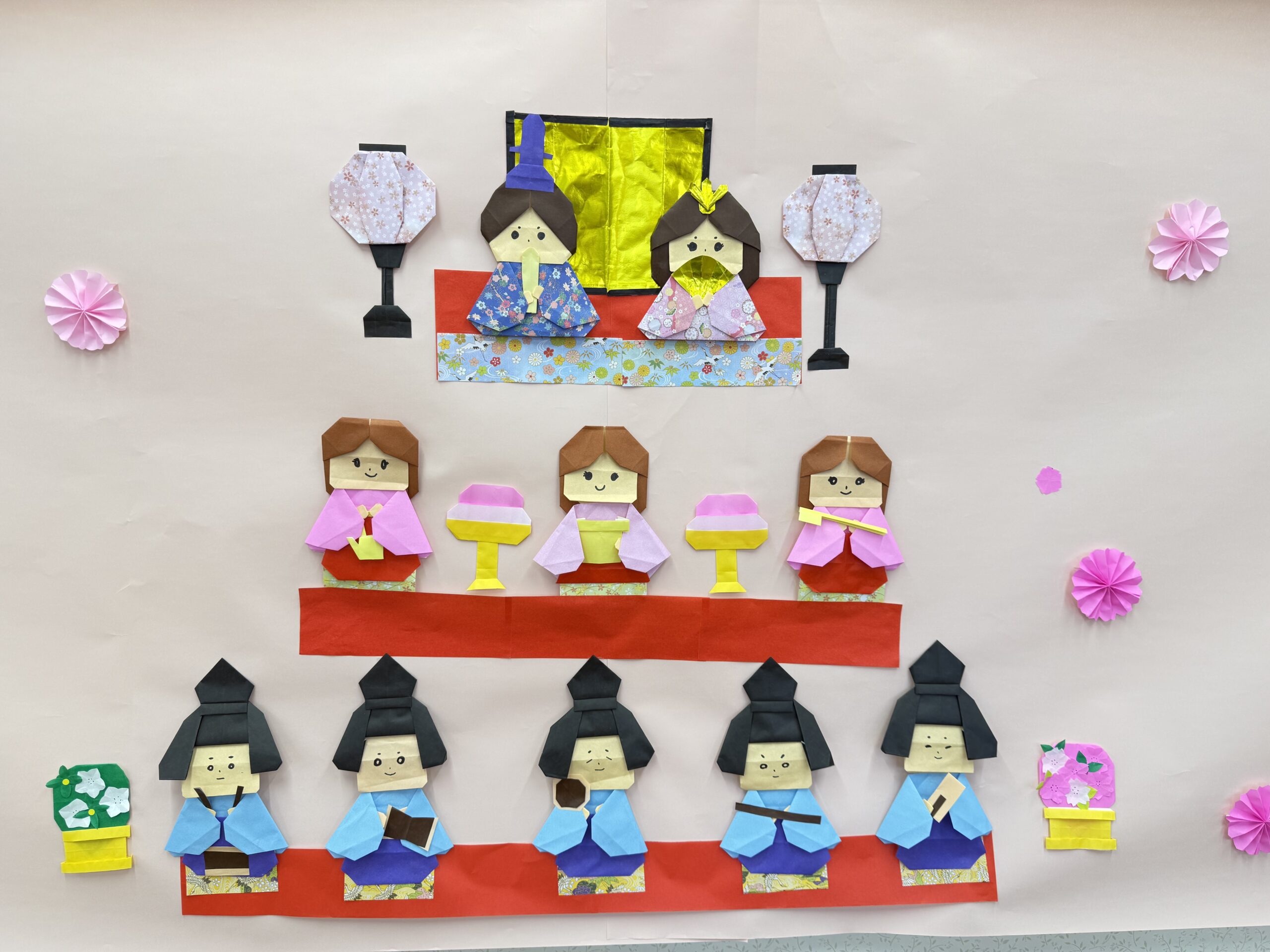 あおいの家でも先日の折り紙を壁に貼っています。 ご入居の方々からも「かわいい」「ひな祭りだねー」「キレイに作ったね」とお喜びの声をいただいています。